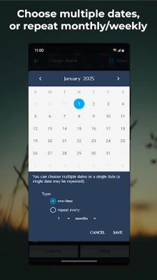 ✔ Alarm type: one-time, weekly repeat, or a specific date in the future
