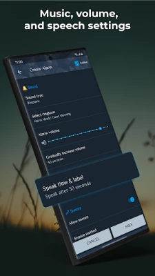 ✔ Speak time: say the time after your alarm starts and repeat at an interval of your choice